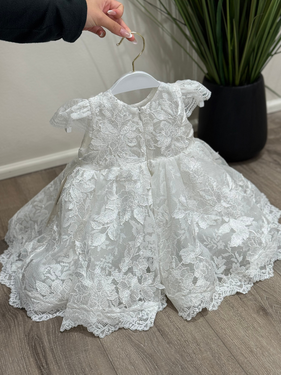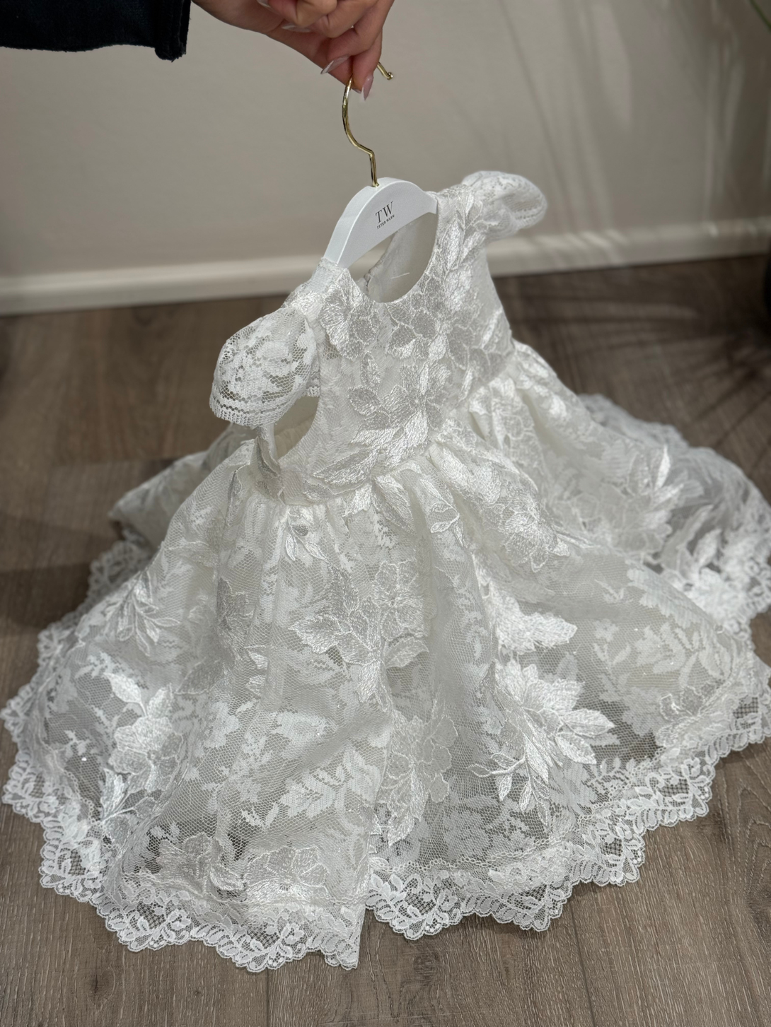 Delicate baby girl's baptism dress in off-white, featuring charming cap sleeves and floral lace detailing. A timeless, elegant choice for christenings or special blessings.