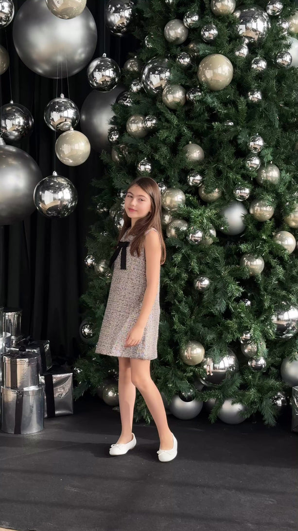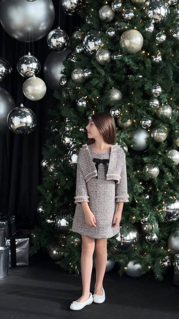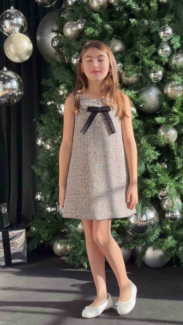 Chic and timeless, the Bianca SF64 dress offers a refined look for any girl’s special occasion. Crafted from soft pink and black tweed with subtle sparkle, this dress blends classic elegance with a playful, modern touch. The fitted bodice features a clean round neckline highlighted by a delicate bow at the waist. The lightly flared skirt flows gracefully, creating a polished yet comfortable silhouette. Perfectly styled with coordinating outerwear, the Bianca DF64 dress balances structure with charming detail.