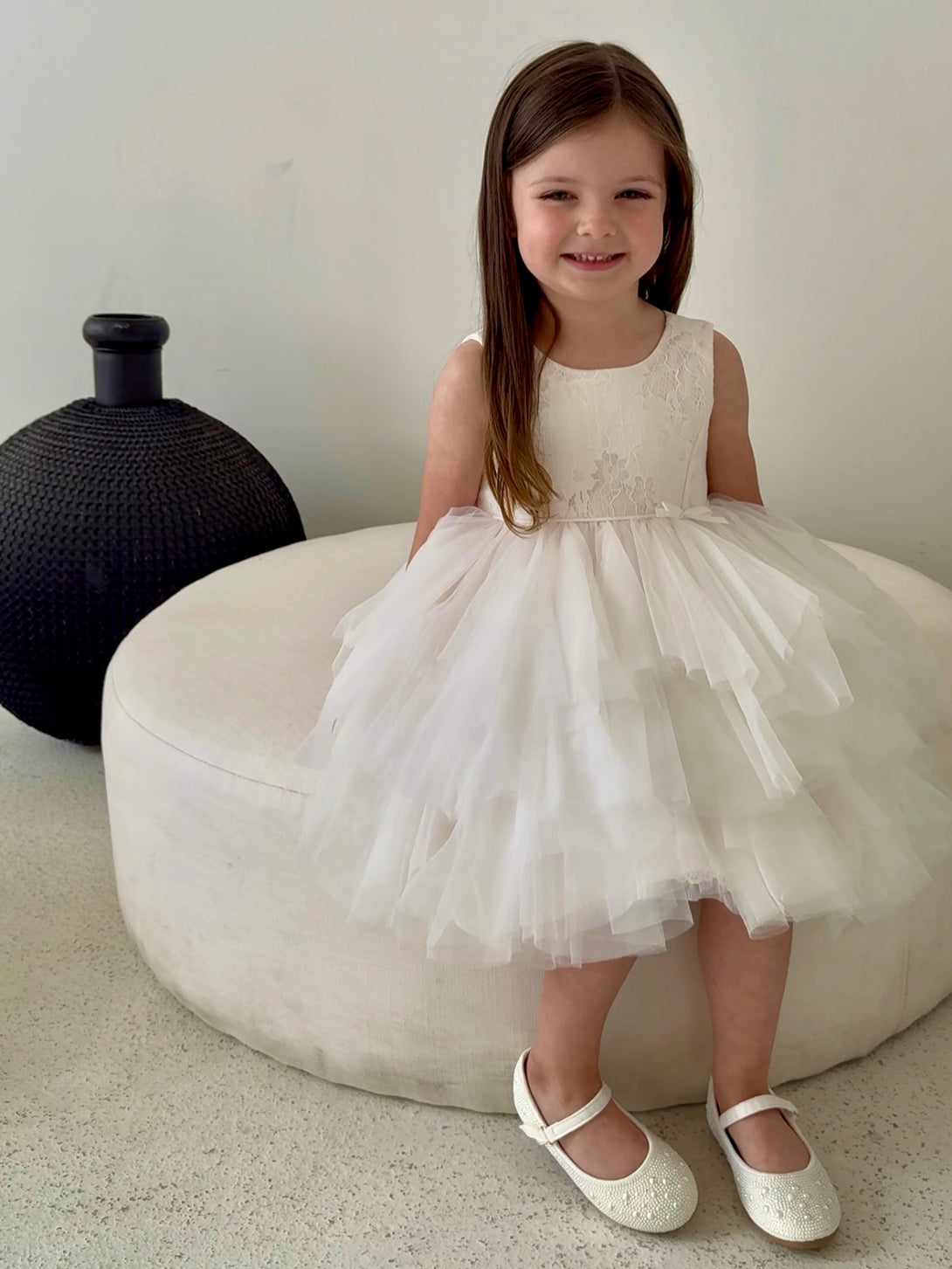 Sweet, stylish, and full of whimsy, the Broadway dress is the perfect pick for your little girl. Designed with a delicate lace bodice and a playful layered tulle skirt, this dress brings volume and movement in the most charming way. Whether she’s walking down the aisle or twirling at a party, your little one will feel like the belle of the ball in this enchanting, ballerina-inspired silhouette.