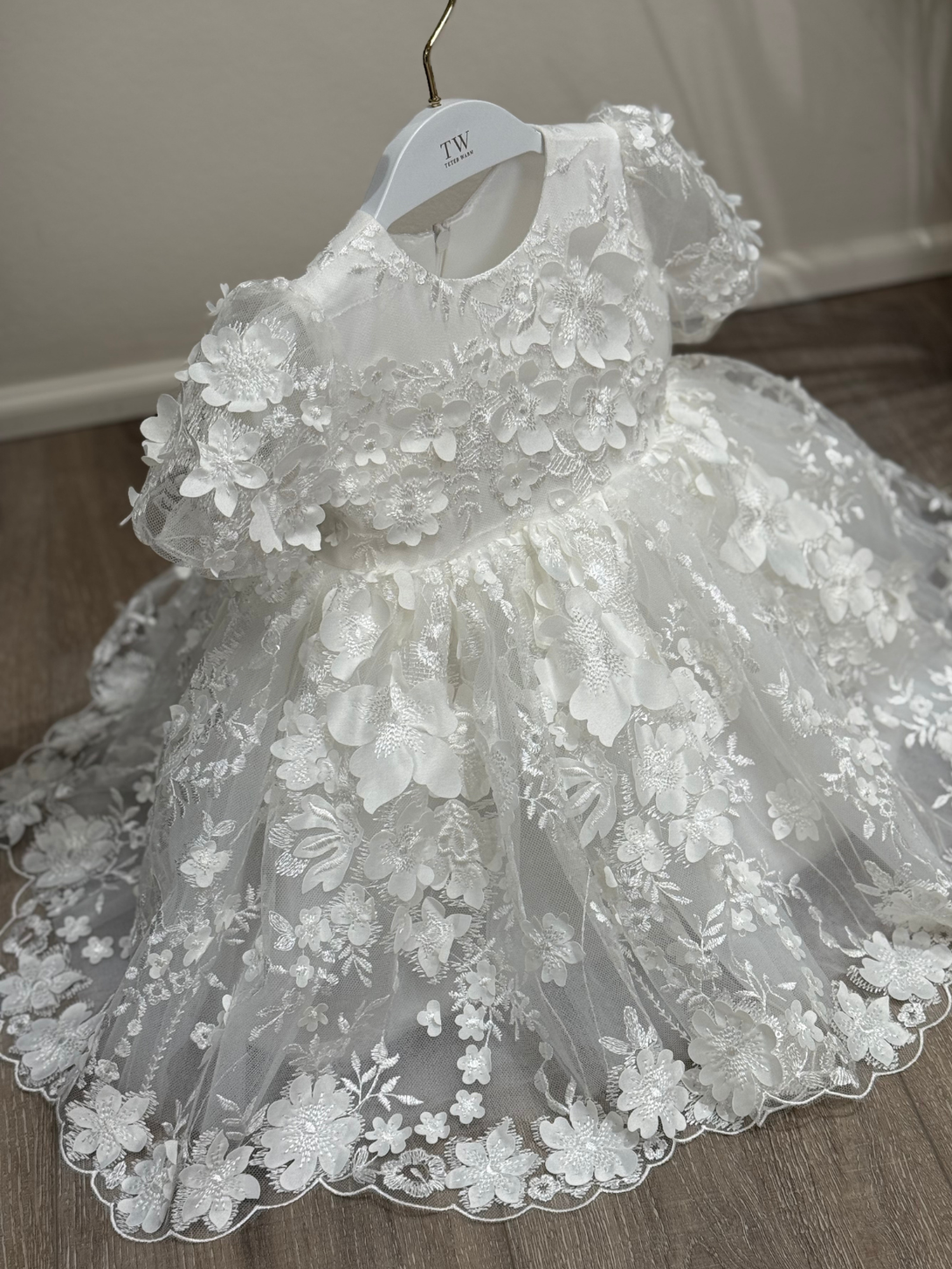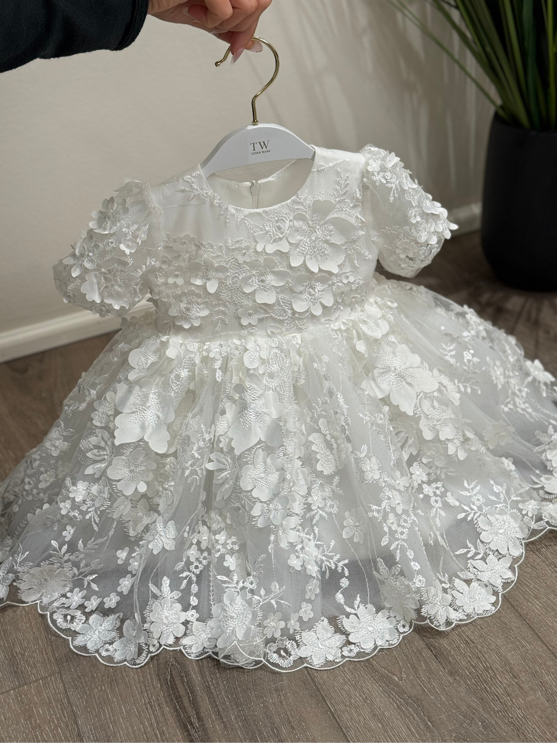 Timeless off-white baby dress, featuring exquisite 3D floral lace. The 3/4 sleeves offer a graceful, classic look—perfect for a christening, baptism, or blessing ceremony.