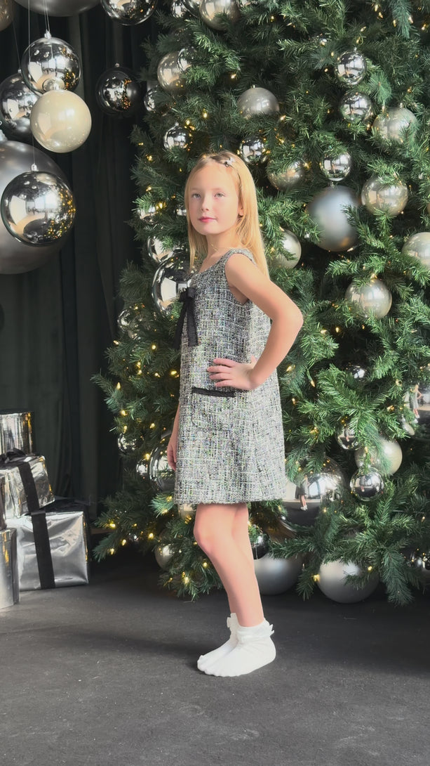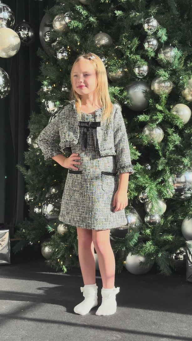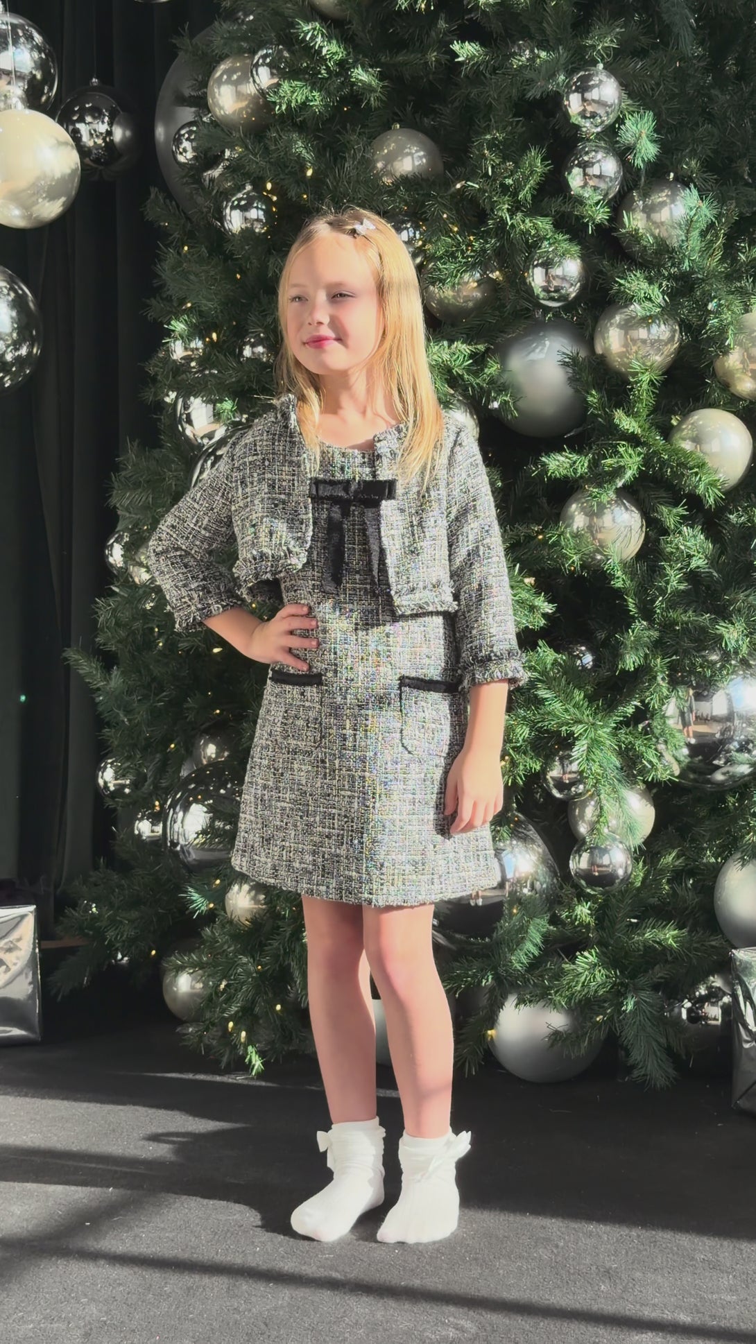 Sophisticated and charming, the DF62 dress offers a refined look with playful details for any girl’s special day. Crafted from rich multicoloured black-and-white tweed with subtle hints of blue and sparkling threads, this dress combines classic elegance with a touch of modern sparkle. The fitted bodice features a round neckline, complemented by a delicate bow at the chest and two cute front pockets for a sweet, practical detail.