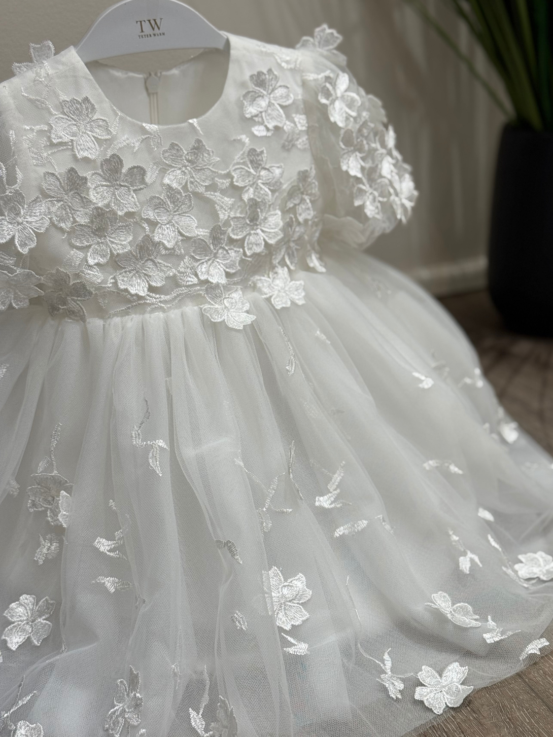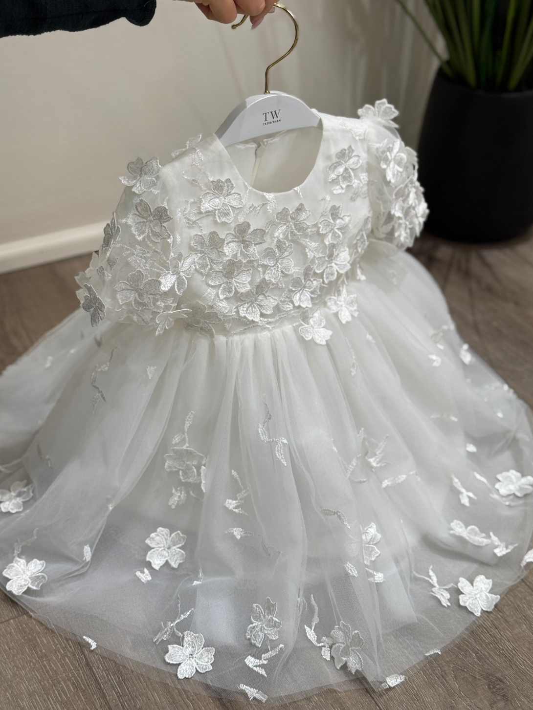 Stunning off-white baptism dress, adorned with delicate 3D floral appliques. The bodice is beautifully covered in soft floral details, while the skirt features scattered blossoms for a subtle, ethereal look.