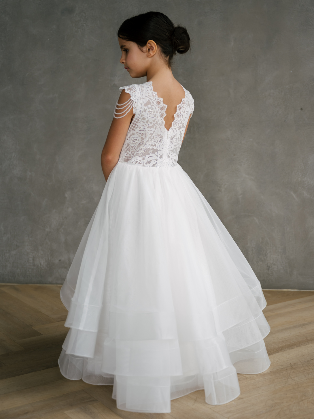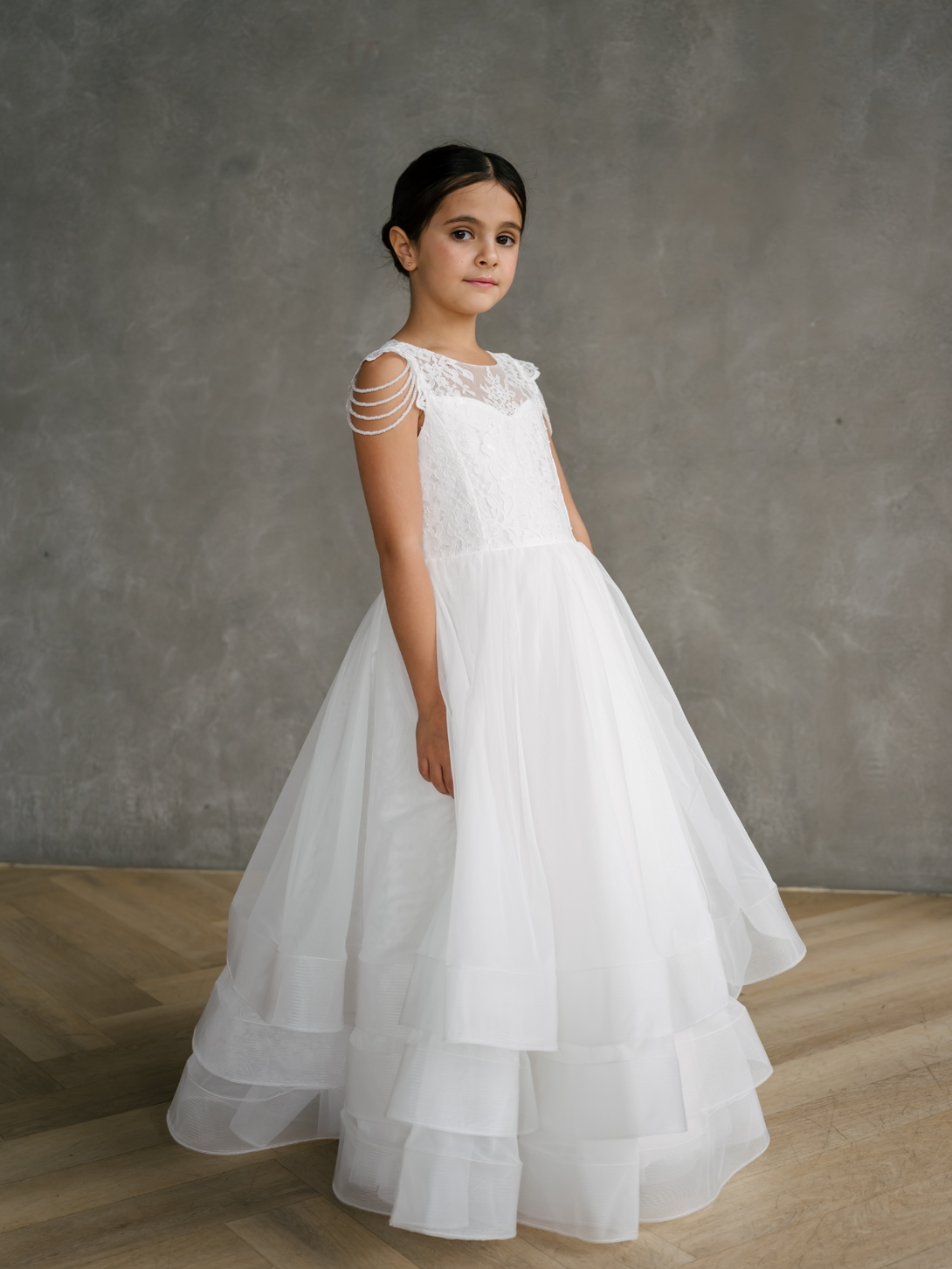Lorelai – Girl’s Pearl Shoulder Lace Horsehair Communion Gown