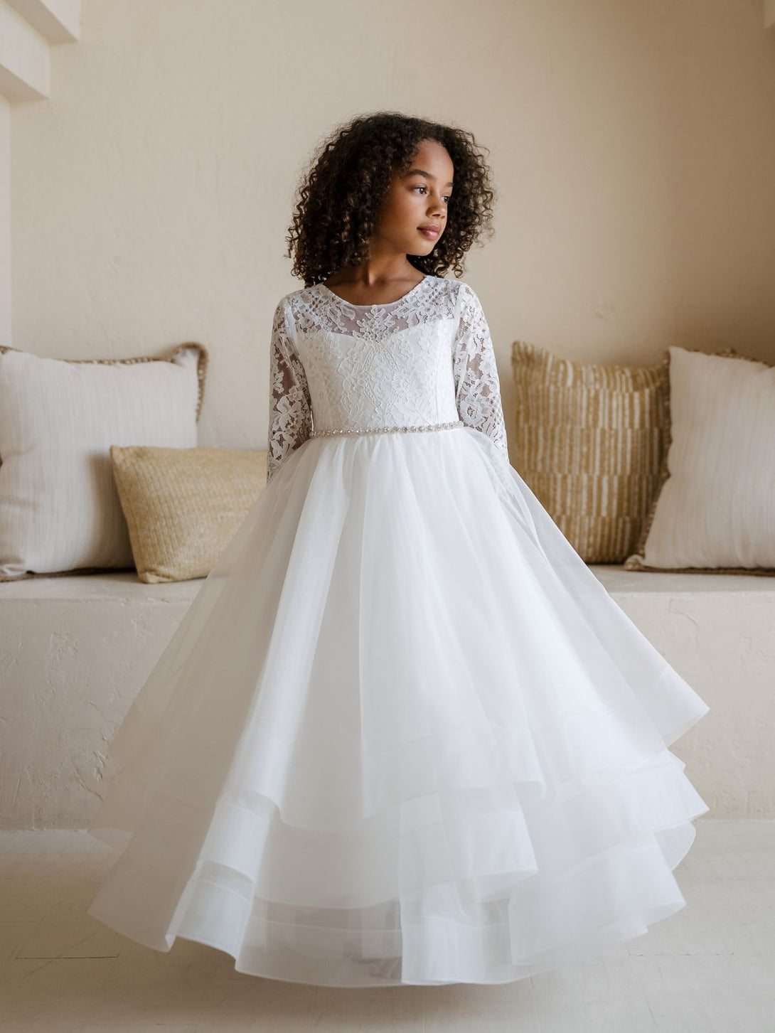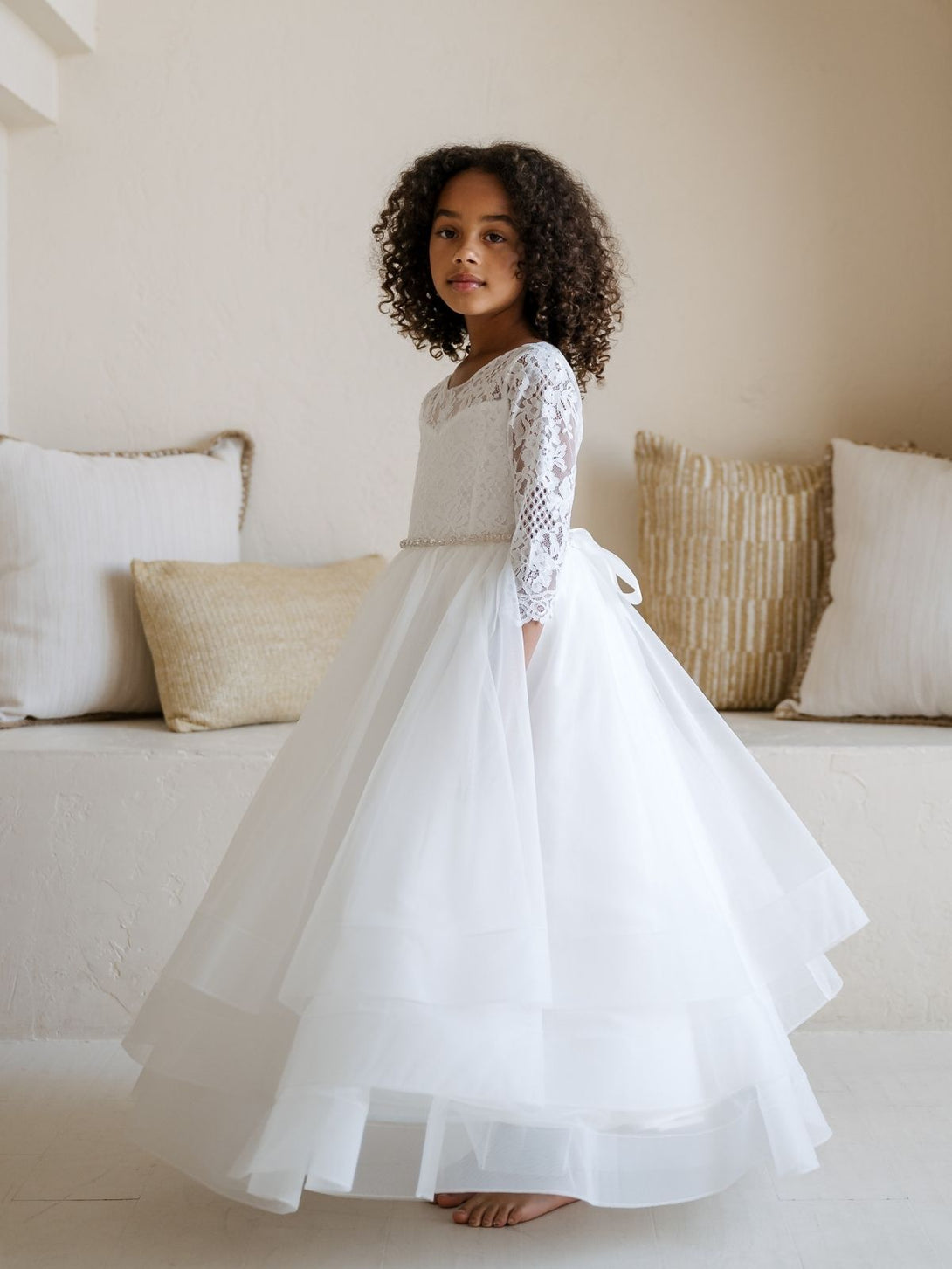 This graceful communion dress features a lace bodice and half sleeves with tiered horsehair bottom.