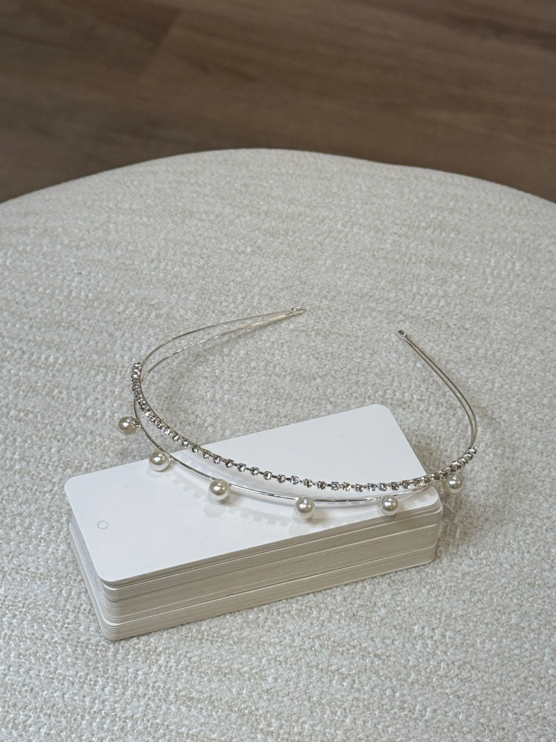 Add a touch of sparkle to any special occasion with this delicate silver headpiece, featuring two elegant bands—one adorned with faux pearls and the other with small square shape rhinestones.