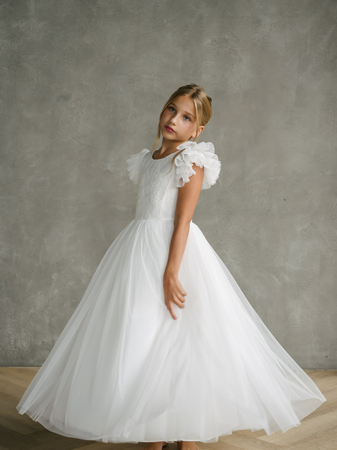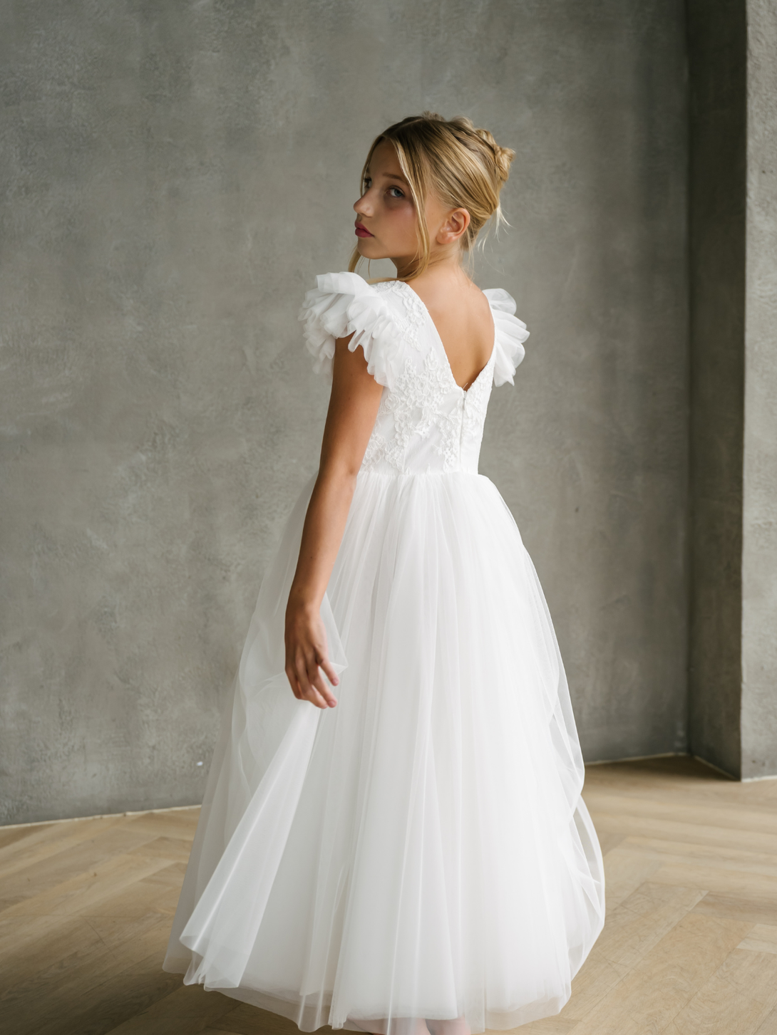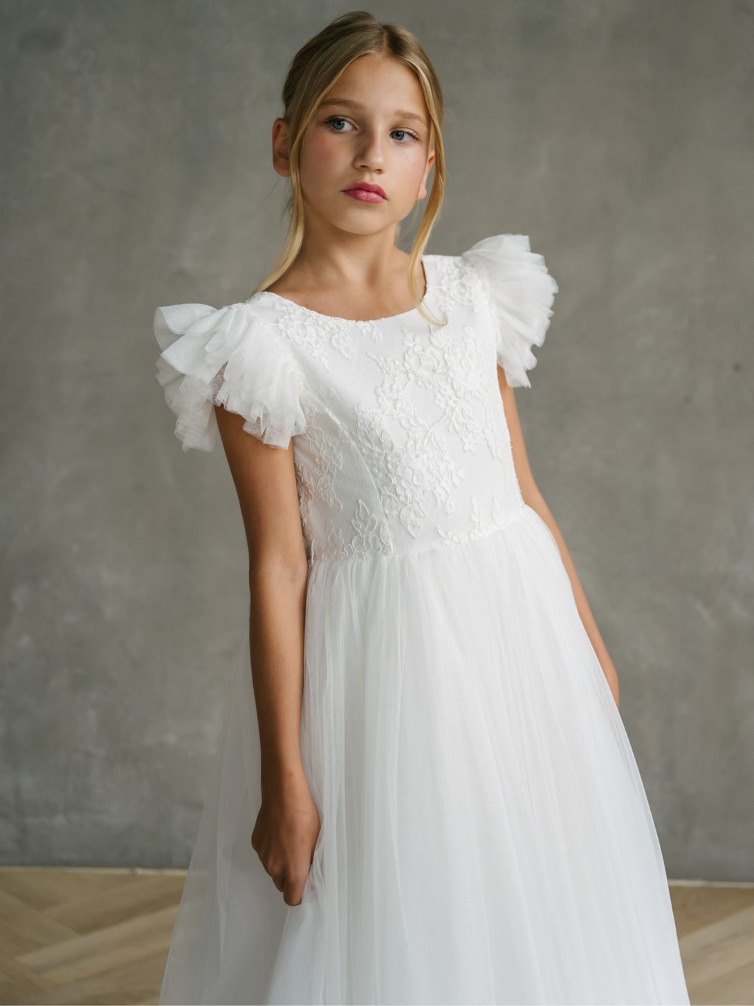 This off-white Communion dress is designed to make a First Communion memorable. The dress features delicate tulle cap sleeves that add a soft, angelic touch, perfectly complementing the refined lace patterned bodice with V-back and round neckline. The straight tulle skirt offers a clean and graceful silhouette, flowing gently with every step.