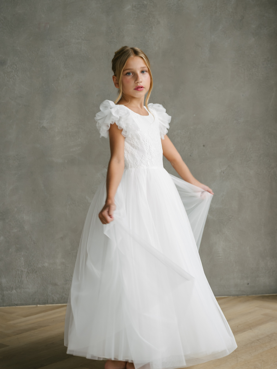 Morgan - Off-White Girl's Communion Dress with Tulle Cap Sleeves and Skirt