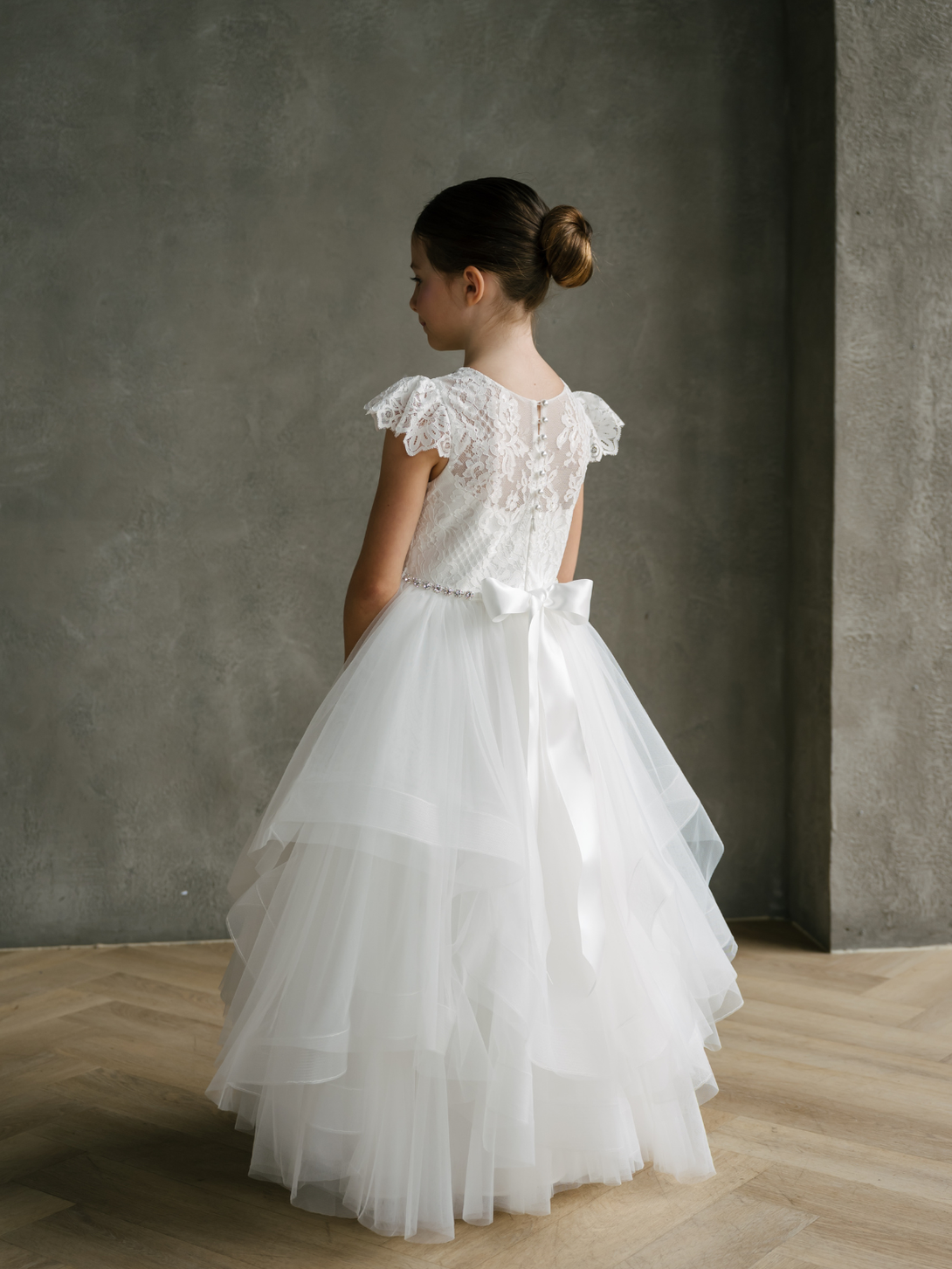 Romantic and graceful, the JK12 dress is a charming choice for communions, weddings and special celebrations. The lace bodice features delicate cap sleeves and a sheer lace overlay at the neckline, creating a refined and timeless look. A row of covered buttons at the back adds a sweet touch. The layered horsehair skirt flows beautifully with cascading tiers, giving the dress both volume and movement for an enchanting finish. Perfect for twirling down the aisle or capturing picture-perfect moments, this dress blends elegance with a touch of whimsy.