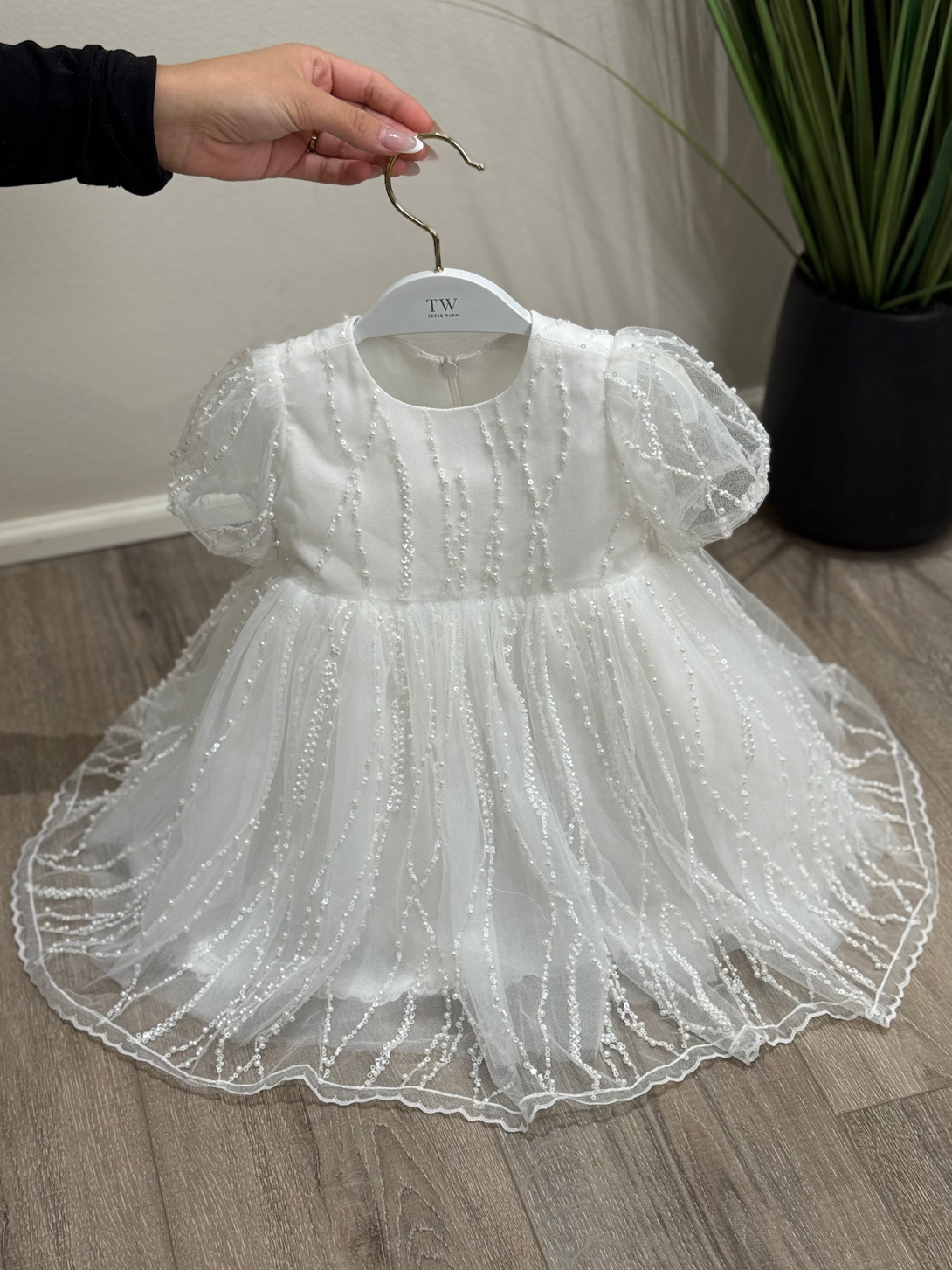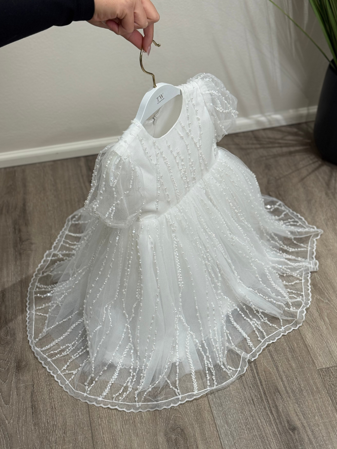 Exquisite dress with delicate lines of shimmering sequins flowing gracefully from the bodice to the hem. The 3/4 sheer sleeves add a soft, angelic touch—perfect for a sacred celebration.