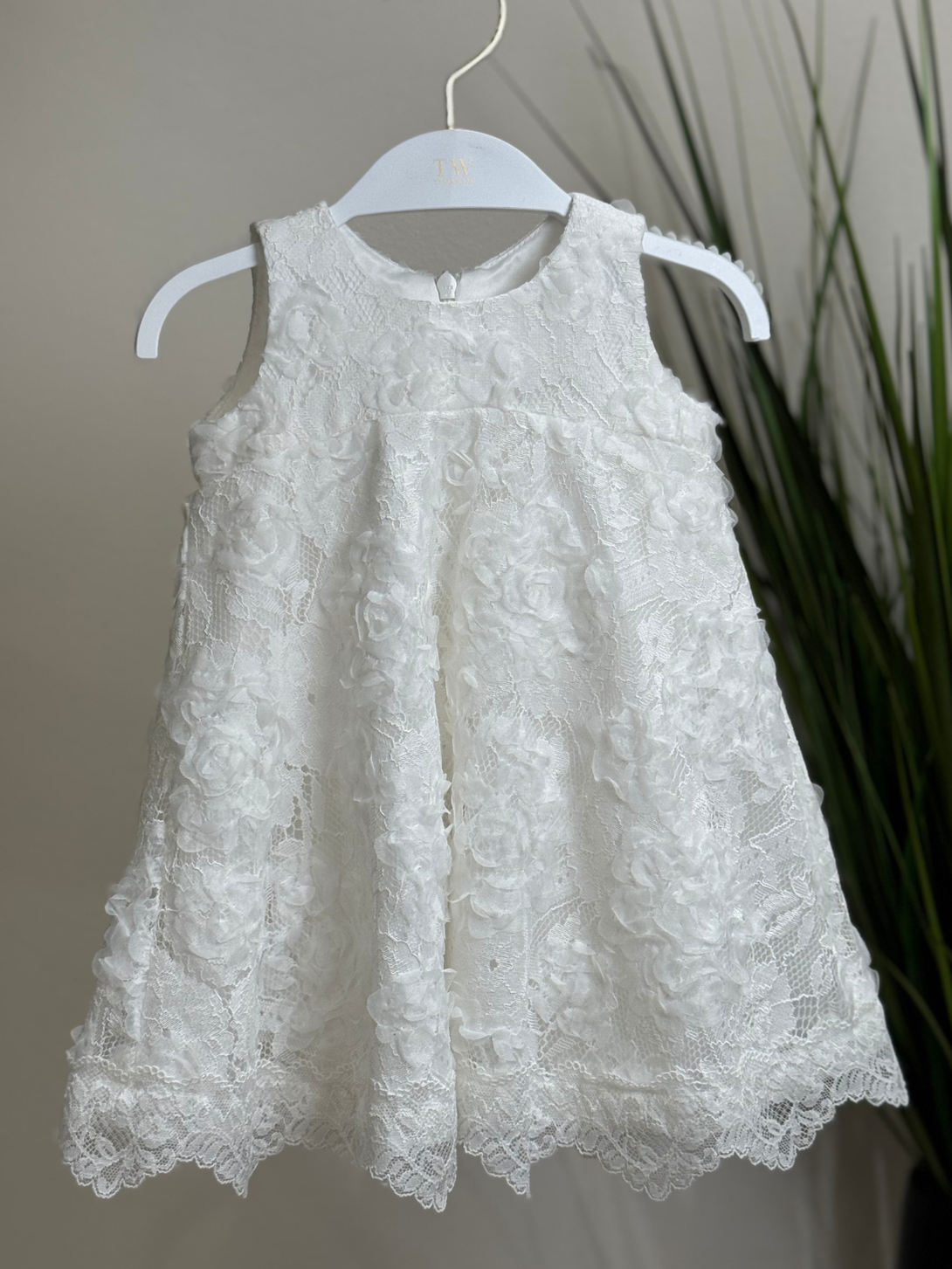 Charming off-white sleeveless dress, featuring a rich floral lace. The delicate trim detailing adds a refined touch, perfect for baptism and christening.