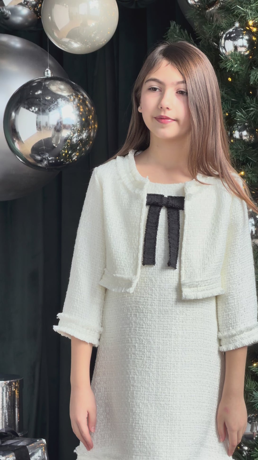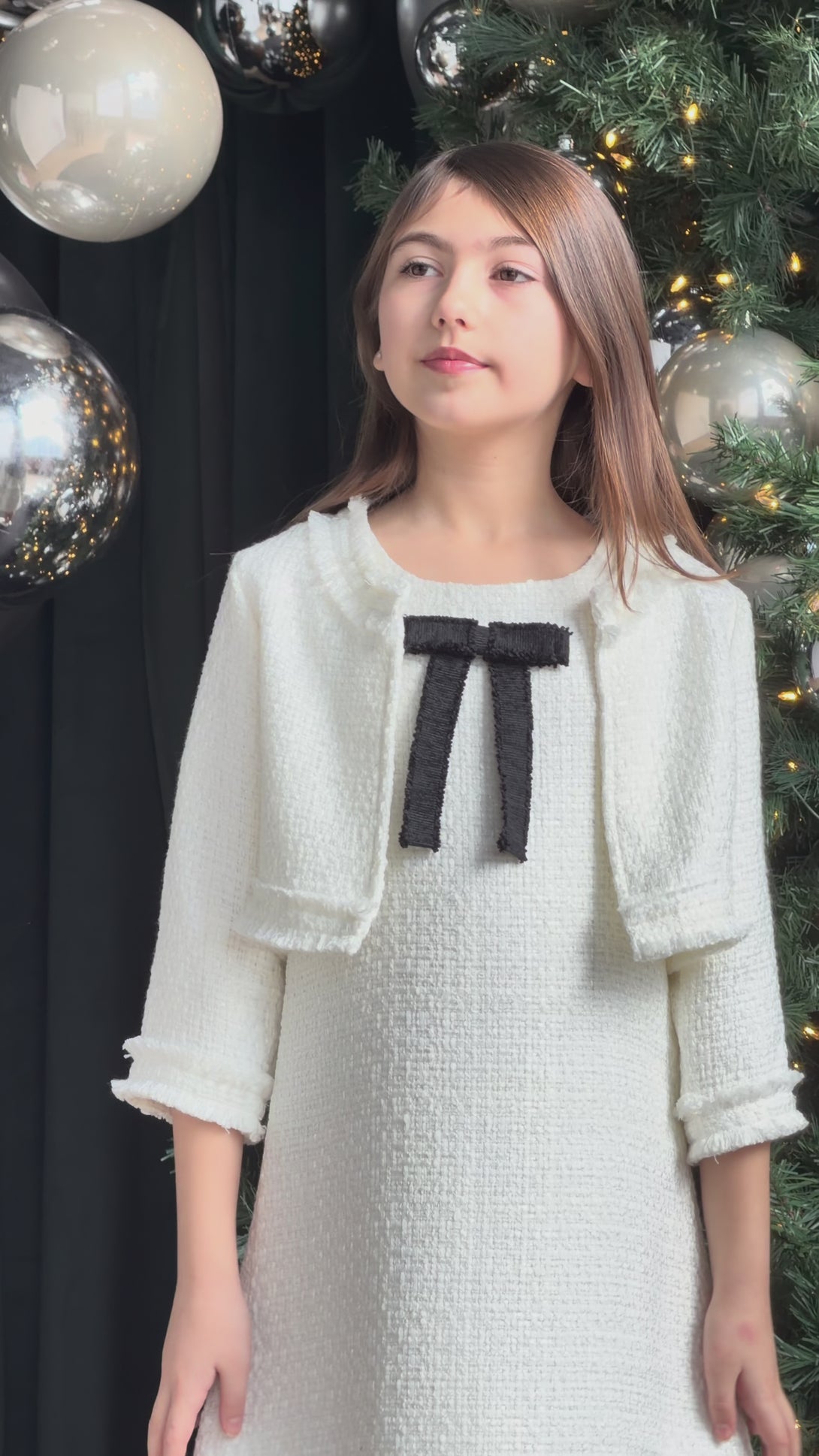 Elevate any special-occasion look with the timeless charm of the Sabrina AF67 jacket. Crafted in a rich cream tweed fabric, this bolero-style layer adds sophistication and texture while keeping the silhouette polished and refined. The soft, frayed edging along the neckline, sleeves, and hem brings a touch of classic elegance, perfectly complementing both simple and detailed dresses. Thoughtfully made to coordinate with dress D67 or other special-occasion styles, this jacket blends style and practicality for a beautifully put-together look.