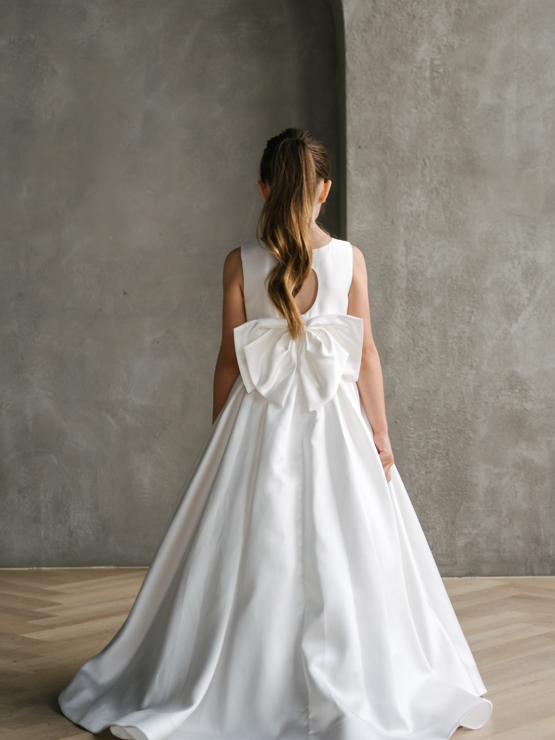 Serene - Shimmering Sleeveless Communion Dress with Satin Bow and Pearl Details