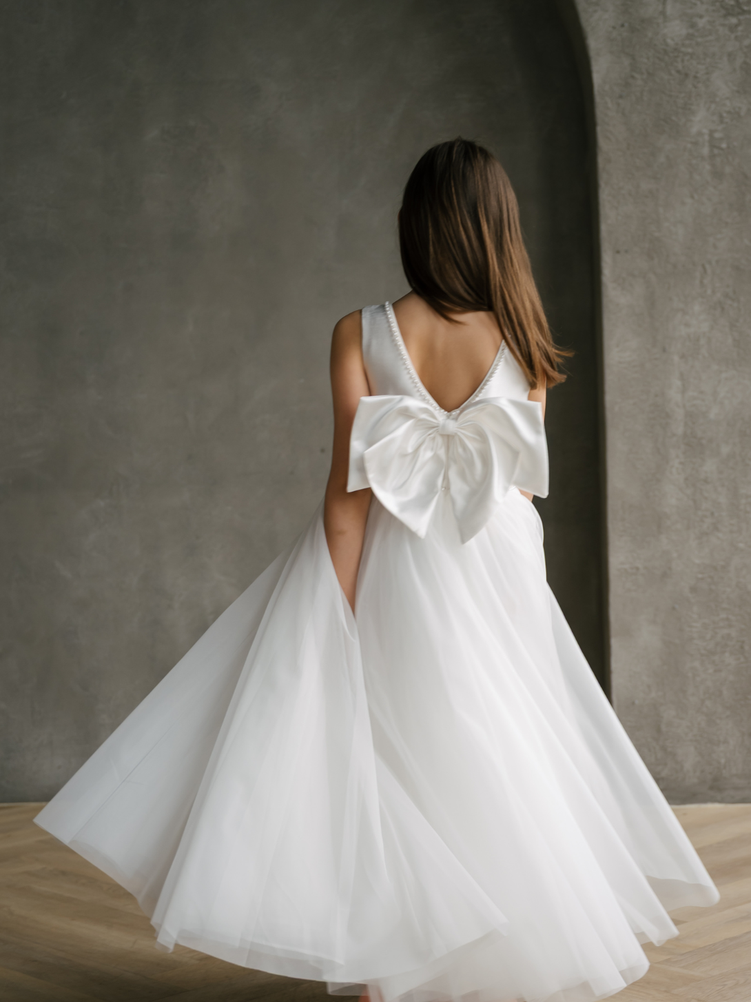 The Sylvia dress combines timeless elegance with a hint of charm. Featuring a smooth satin bodice with delicate pearl detailing along the neckline and waist, it offers a refined yet youthful look. The sleeveless design and scoop neckline keep the silhouette classic, while a large satin bow at the back adds a sweet, standout detail. A full, layered tulle skirt brings soft volume and graceful movement, making it perfect for weddings, communions, or any formal celebration.